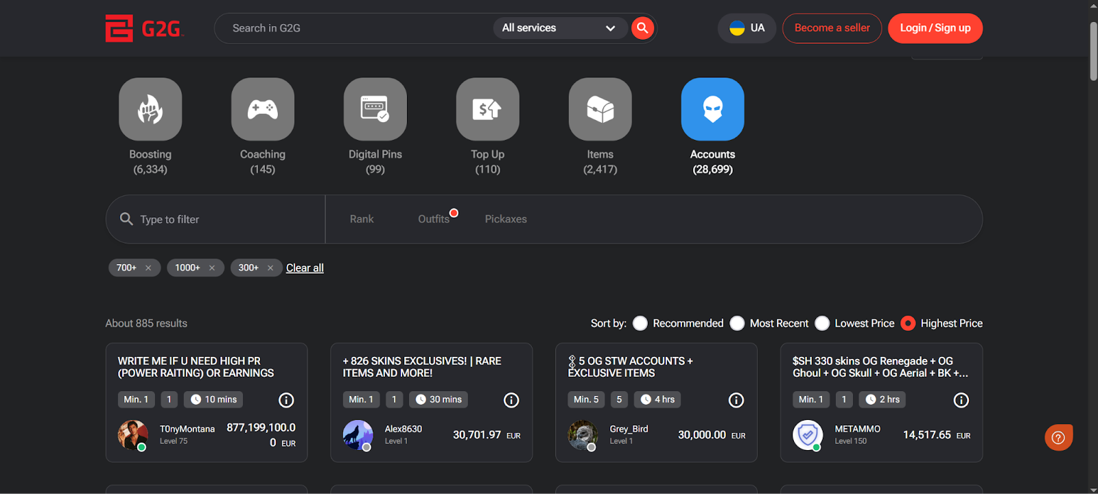 G2G is an international marketplace with active trading of Fortnite accounts, Because the platform has a large number of sellers, players can choose from a wide variety of offers.