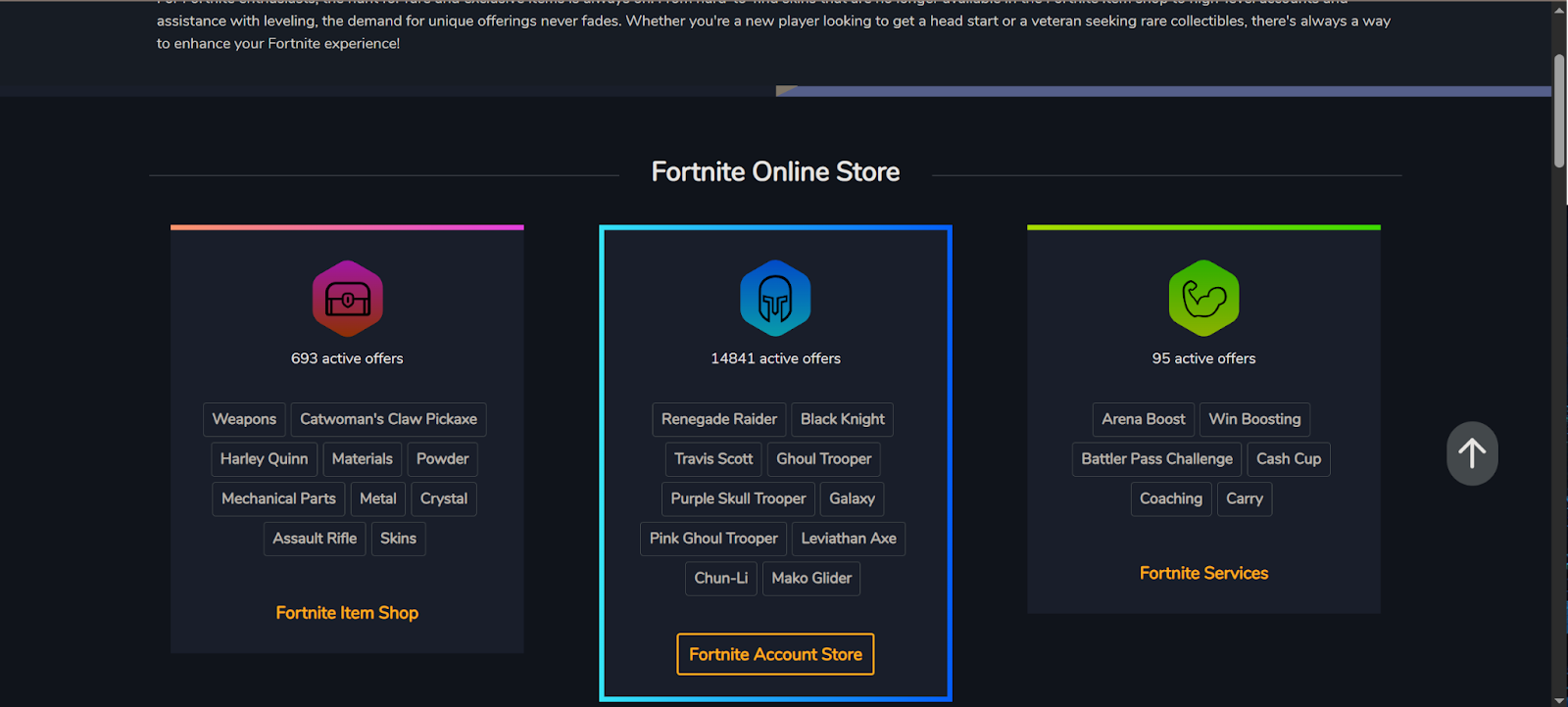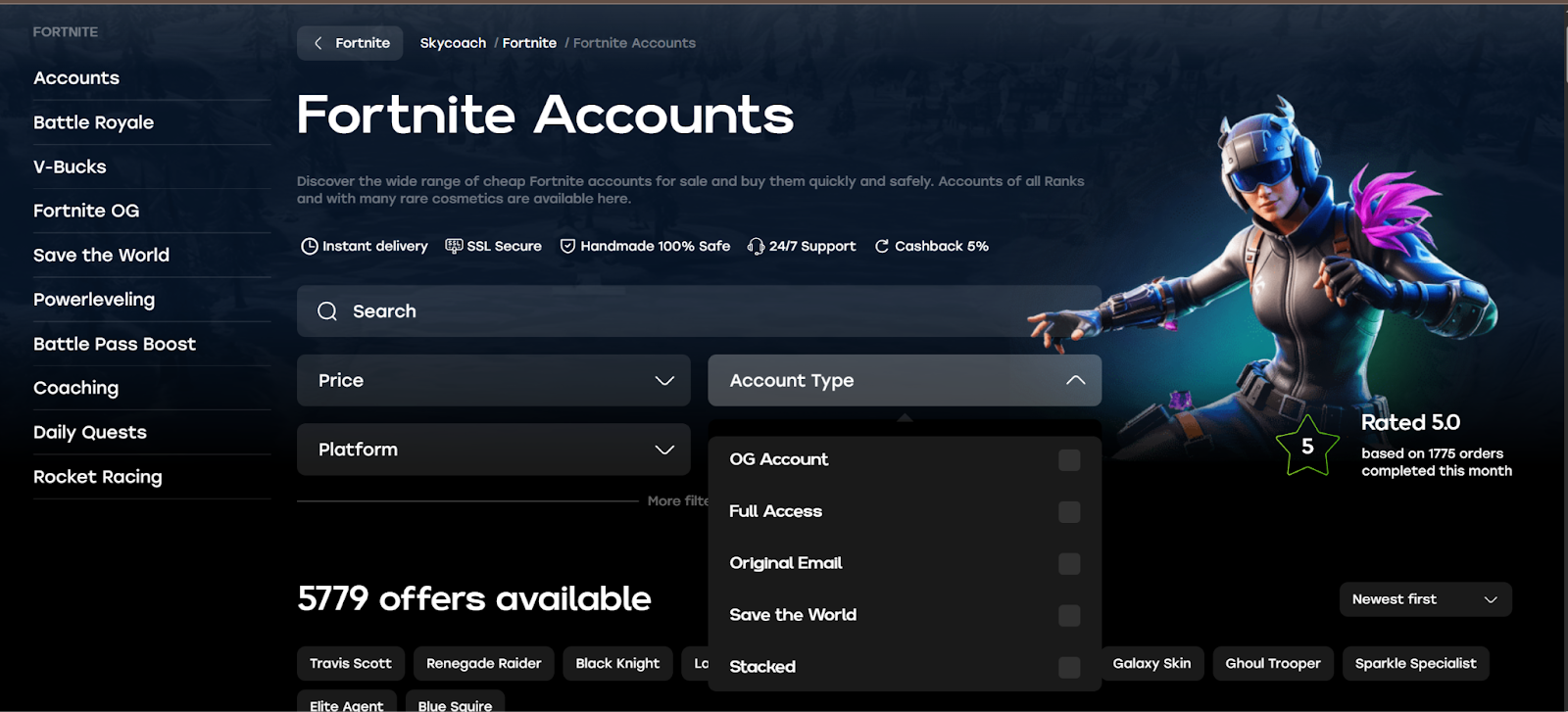 Skycoach is a full-fledged online store covering over 100 games, including a wide range of Fortnite accounts and services.